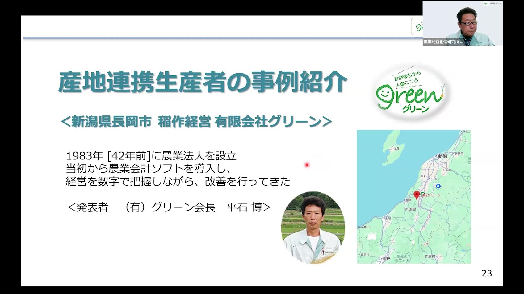 第2部では、産地連携に取り組む生産者の事例として、有限会社グリーン 平石博会長より、加工用米をメインとした「産地連携経営」のポイントをテーマに、ご講演をいただきました。