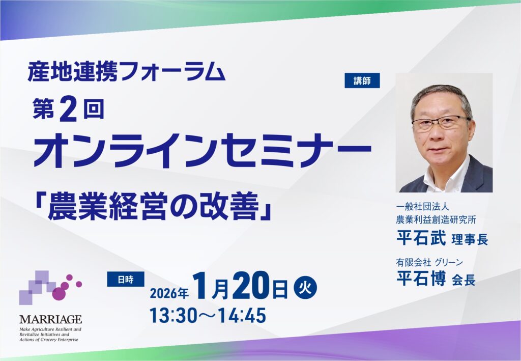 第1部では、一般社団法人農業利益創造研究所 平石武理事長から、簿記データから分析した農業経営の概況、生産者の経営診断に基づいた経営改善方法の選択、その手法としての連携などについて解説をいただきました。