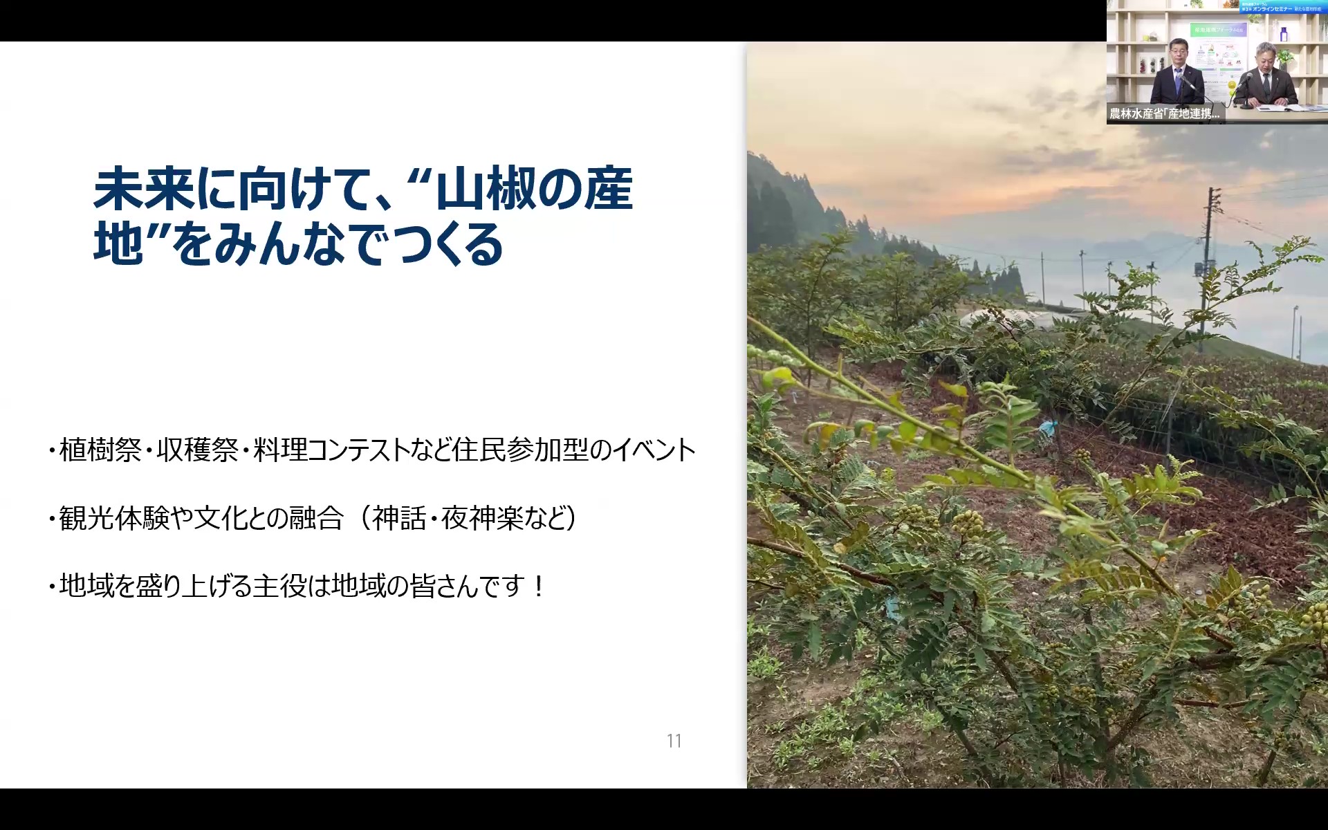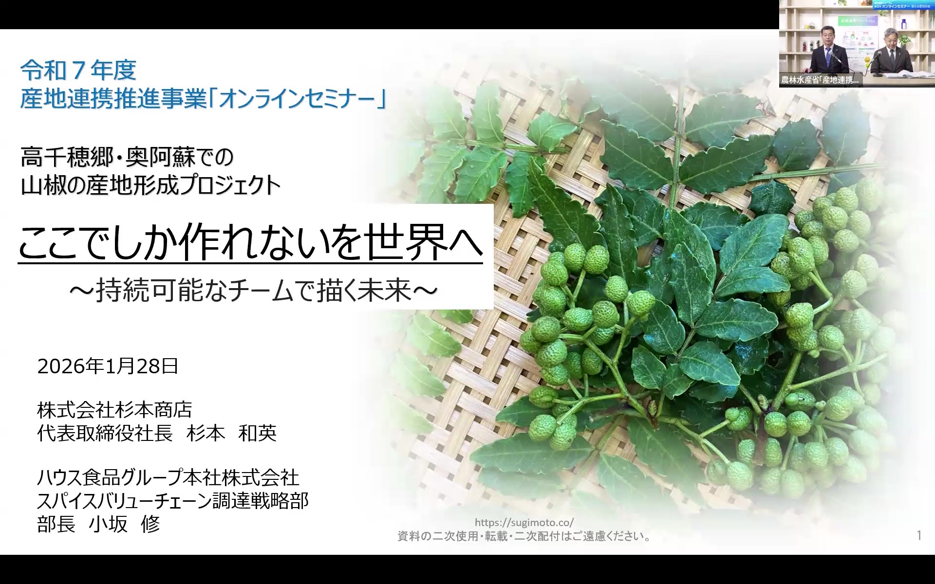 ハウス食品グループ本社よりスパイスバリューチェーン調達戦略部長 小坂氏、株式会社杉本商店より、代表取締役 杉本氏を講師にお招きし、高千穂郷・奥阿蘇地域において、干し椎茸生産者の農閑期を活用し、国産山椒の調達ルート確立を目指す「山椒の産地形成プロジェクト」の事例から、新たな産地を見つけるヒントをご提供いただきました。